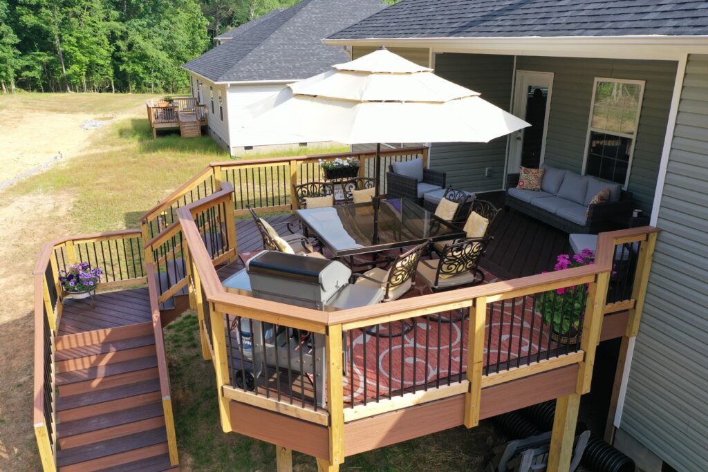 There are a lot of factors to consider when you’re in between deck sizes. The size of your deck depends greatly on how you plan to entertain. If you are only considering a small grilling area and patio set, the space needed to seat 4-6 people requires about 144 square feet. For 10-12 people, you’ll want up to 288 square feet. However, if you want extra breathing room, we recommend at least 392 square feet. Consider these questions so that your builder has a real idea of what deck size will be functionable for you!